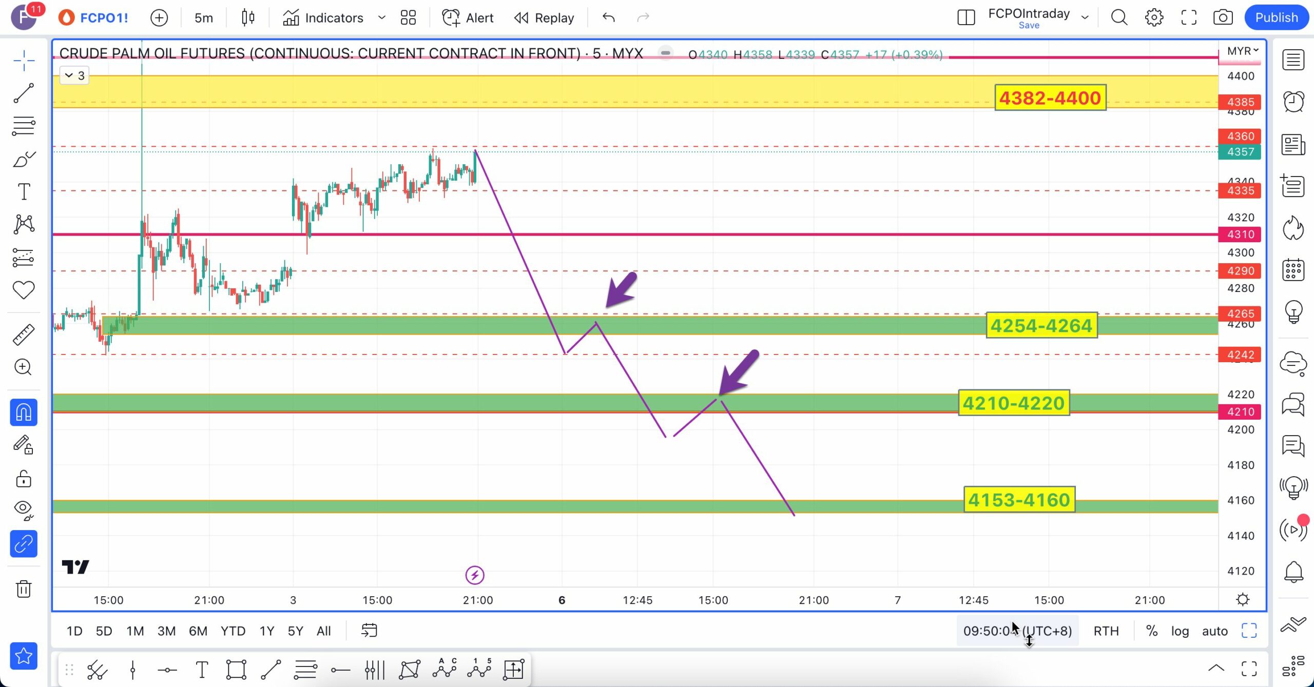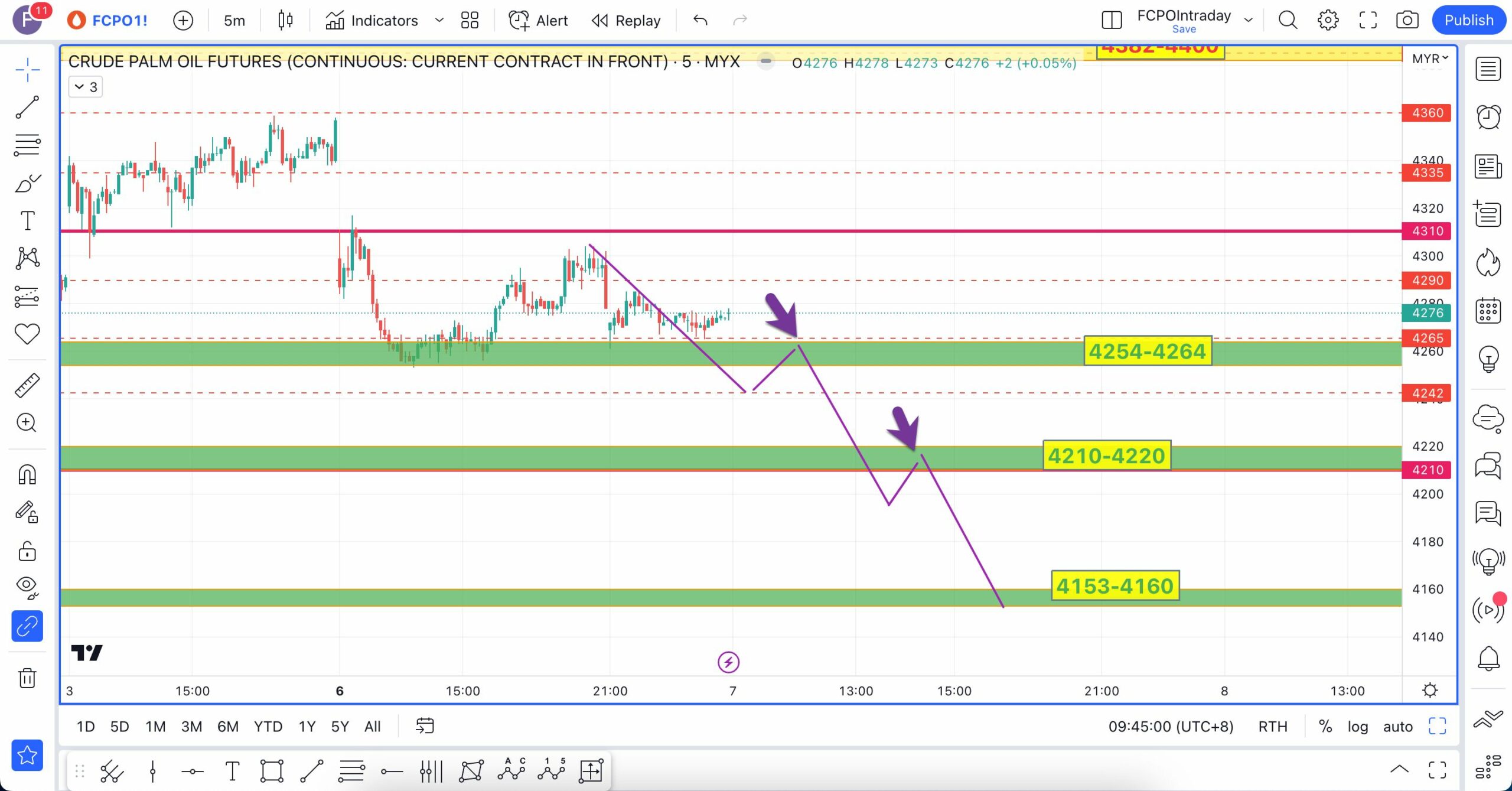 Berikut adalah selepas market unfold. Berdasarkan analisis pada image kedua di atas, dapat dilihat market beri reaksi pada zone yang di label sebagai 4254-4264 dan turun setelah hampir pada garisan 4310.