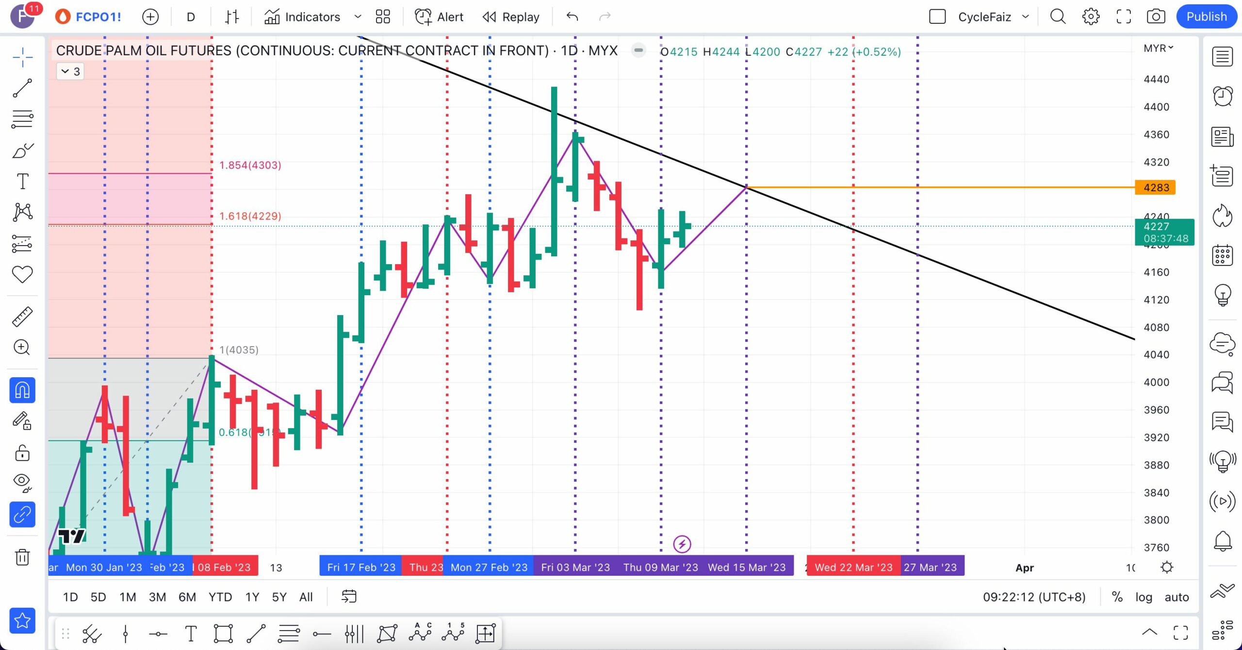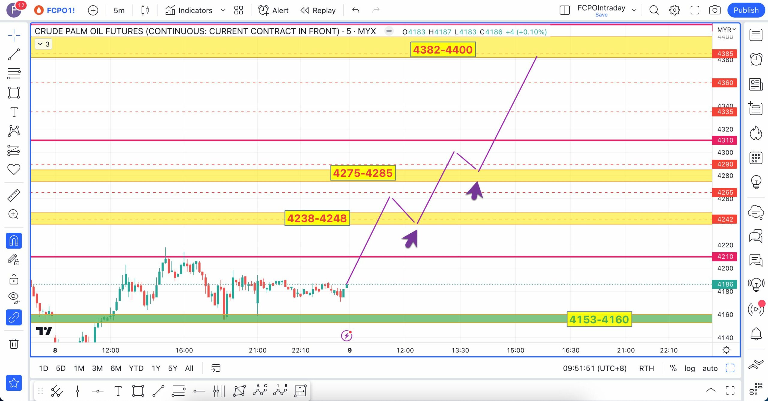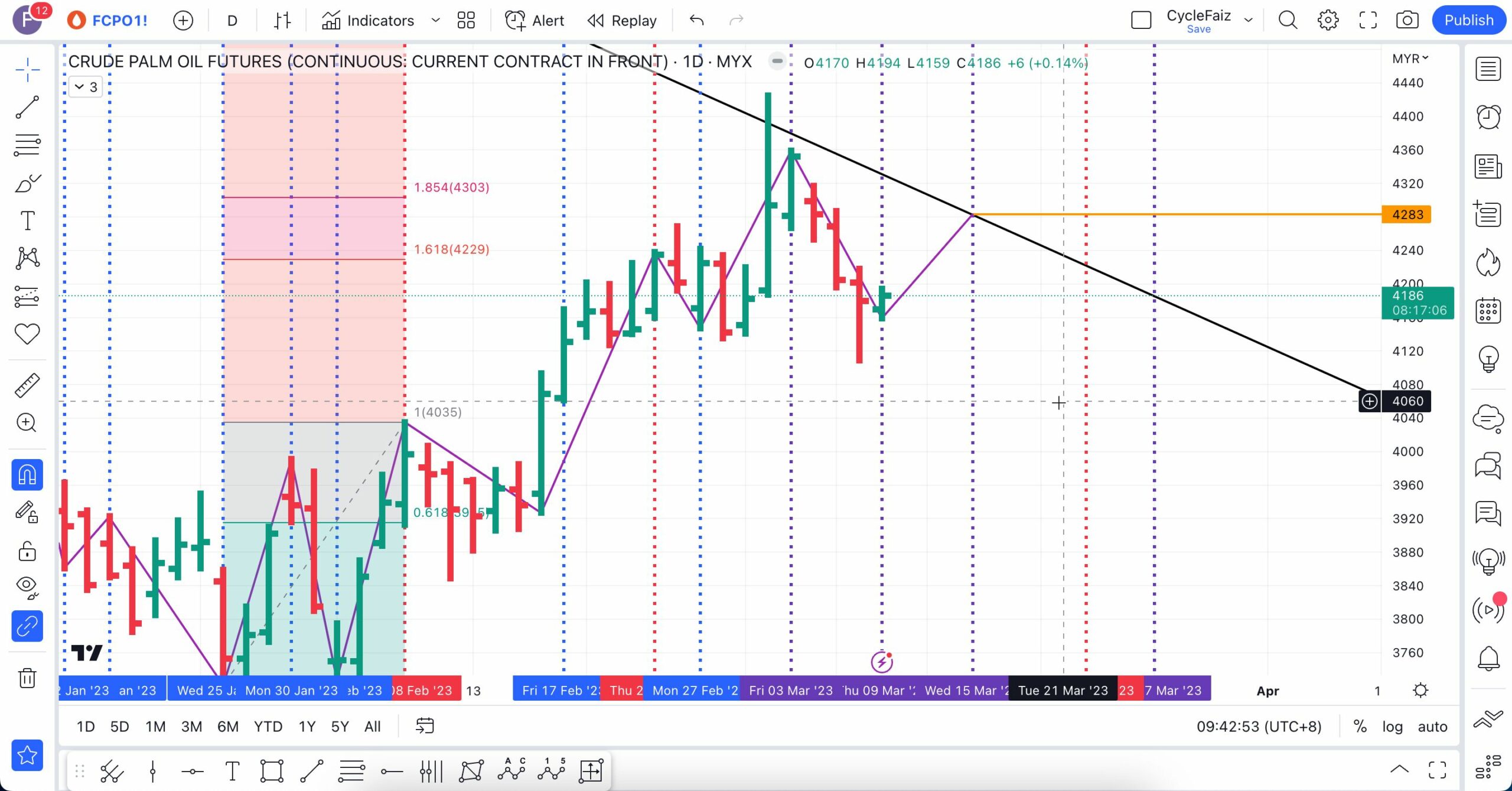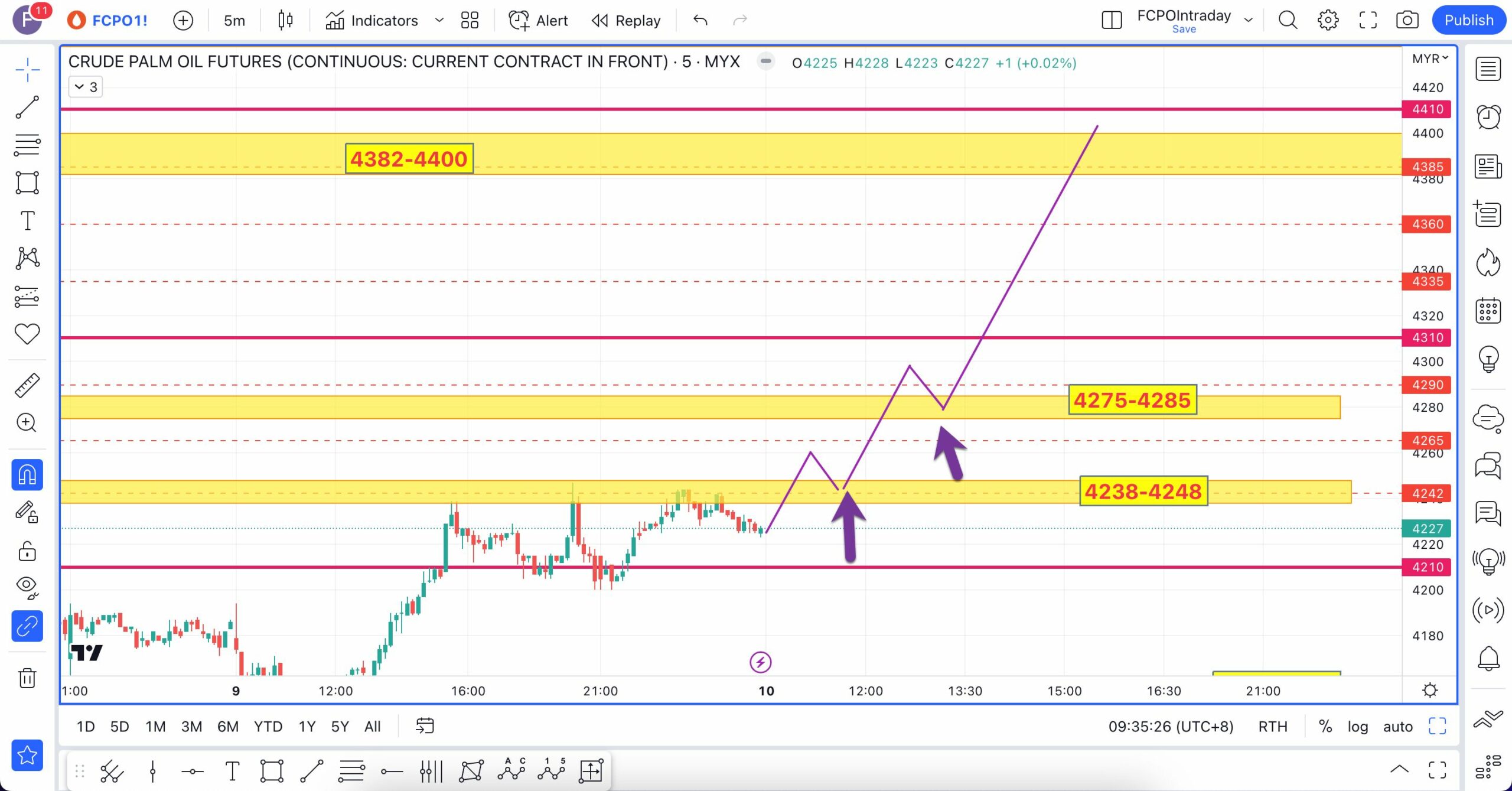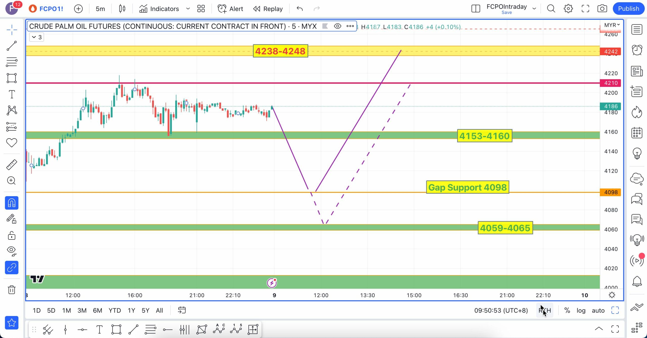 Gambar di bawah adalah setelah market unfold. Tak sampai pada resistance yang dijangka, namun ada satu garisan resistance pada 4210 yang menghalang kenaikan sementara.