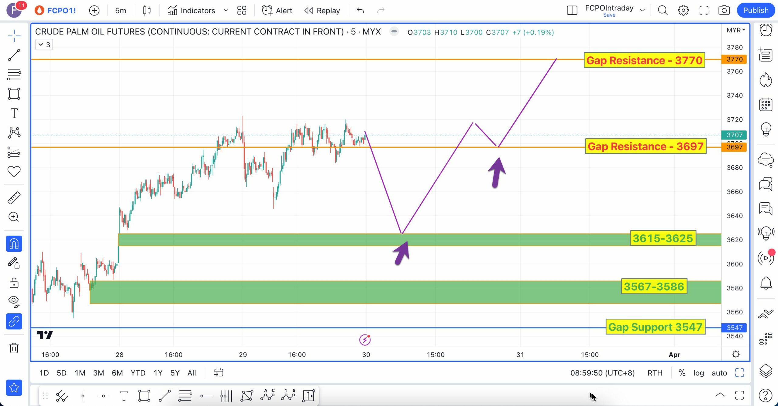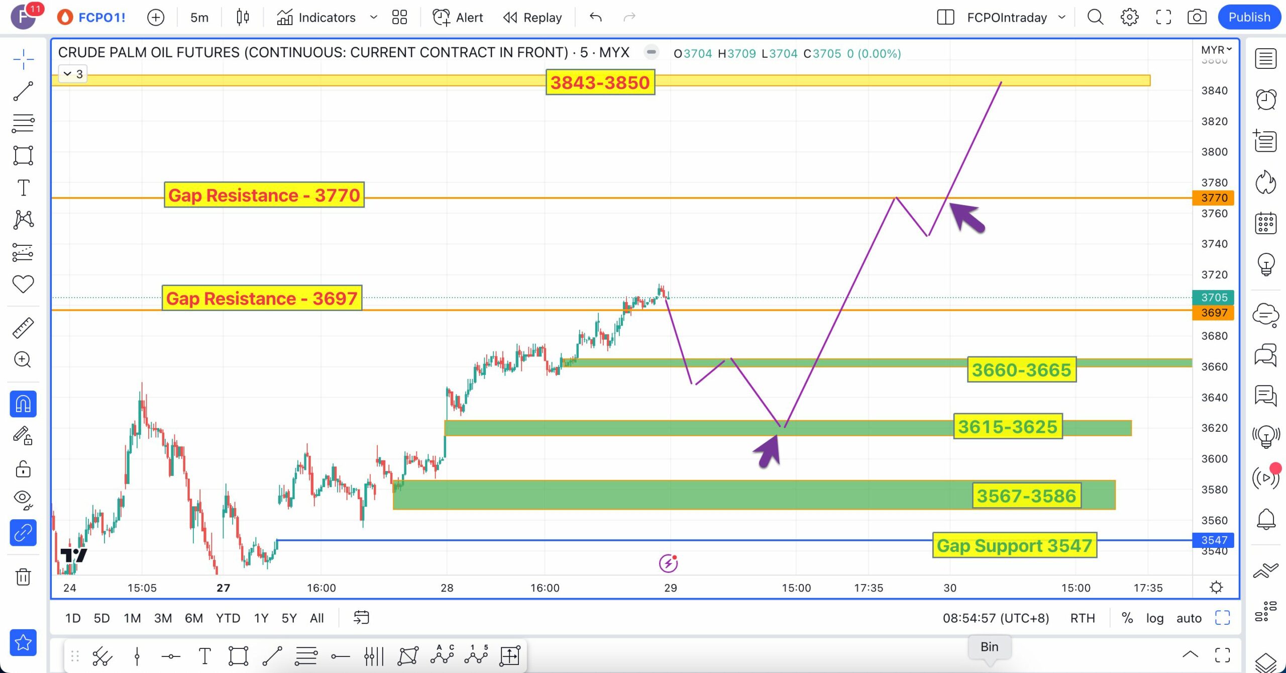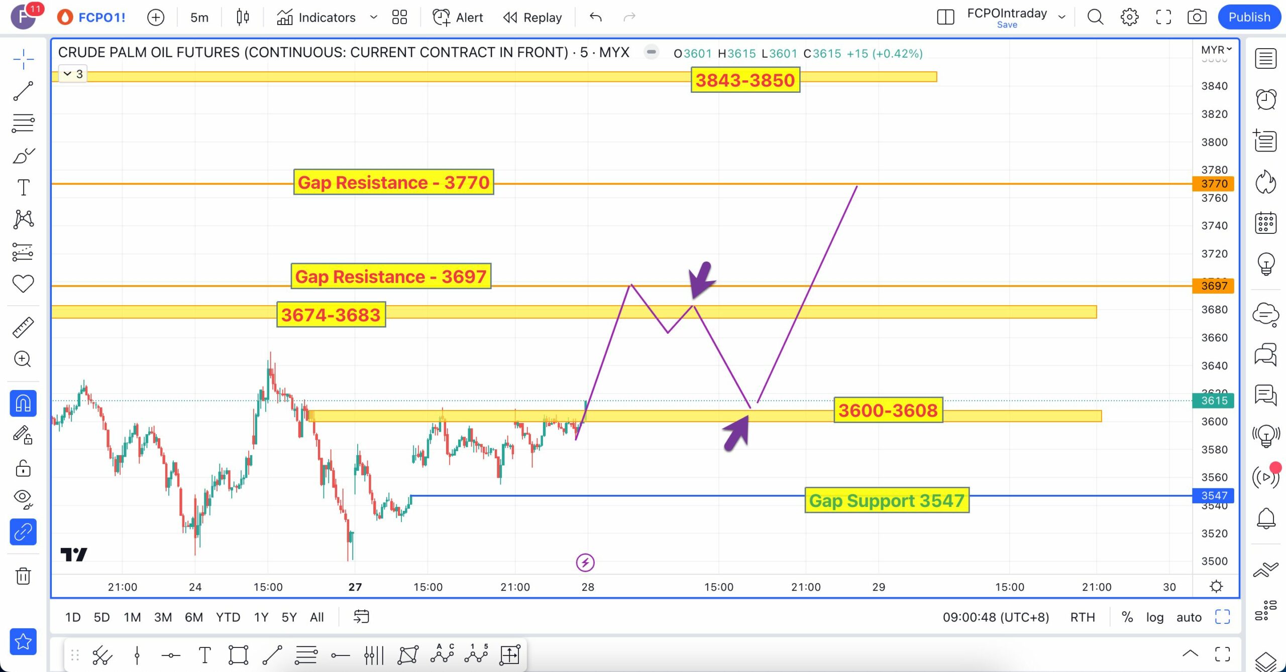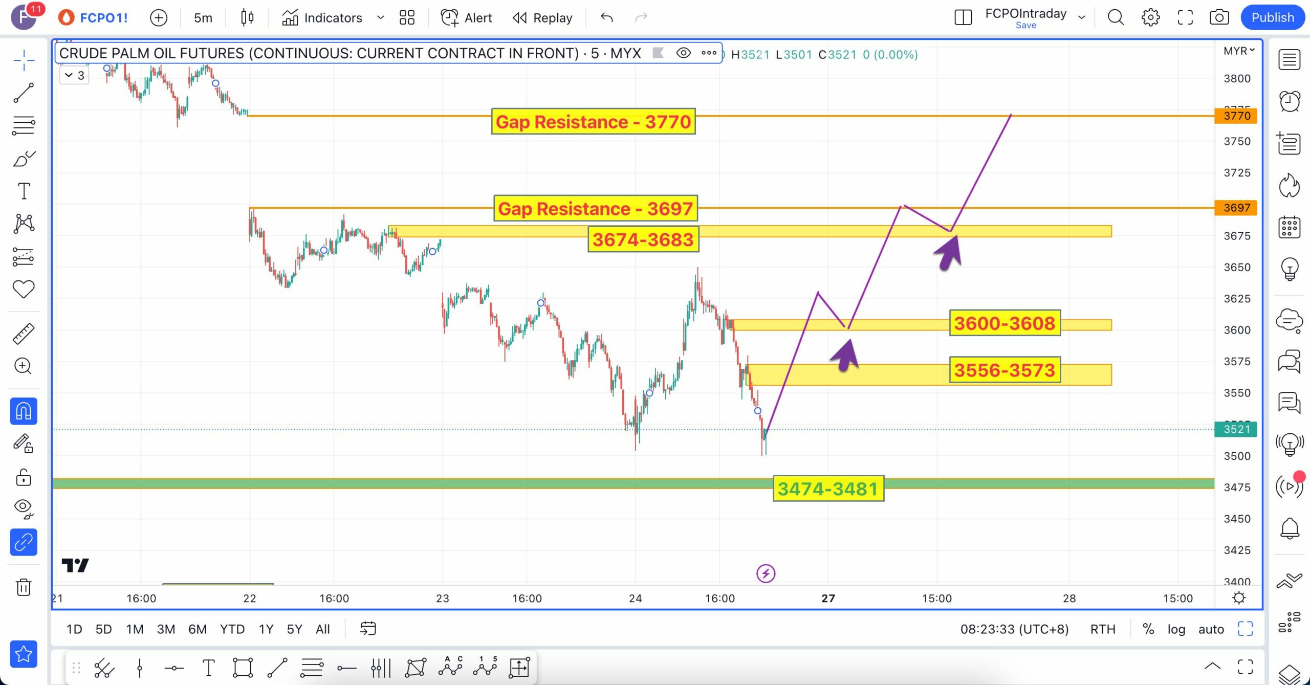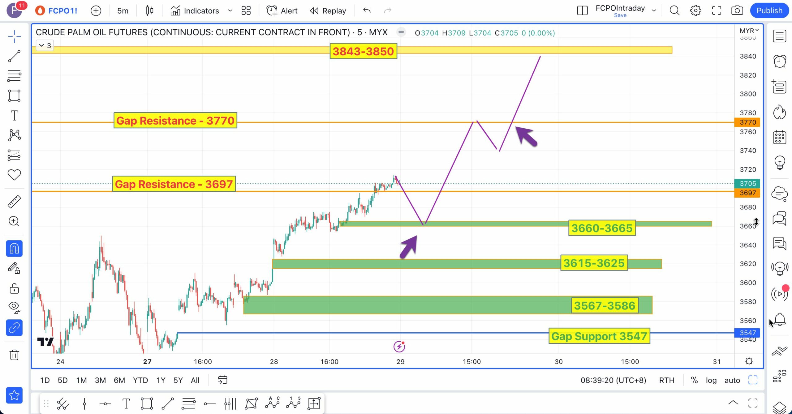 Jangkaan price movement pullback sekitar gap resistance 3770 dan ke atas. Namun due to cycle logic, ada kemungkinan akan berlaku penurunan sebelum naik semula.